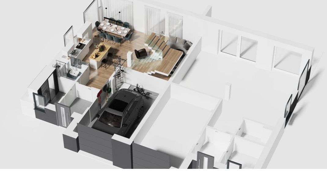Na parterze znajduje się duży salon z częścią kuchenną, łazienka, kotłownia oraz garaż z wewnętrznym przejściem oraz duży tras prowadzący do ogrodu za domem.