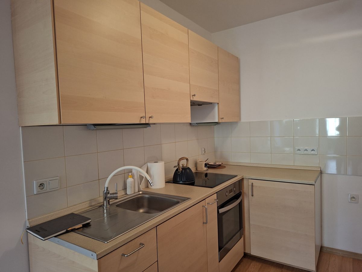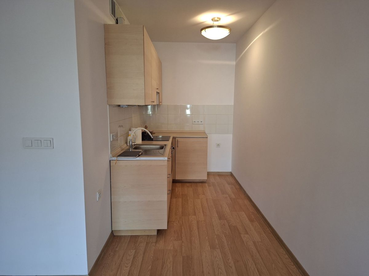 Mieszkanie: aneks kuchenny połączony z salonem, sypialnia, łazienka, korytarz (kuchnia oraz pełna zabudowa w korytarzu)